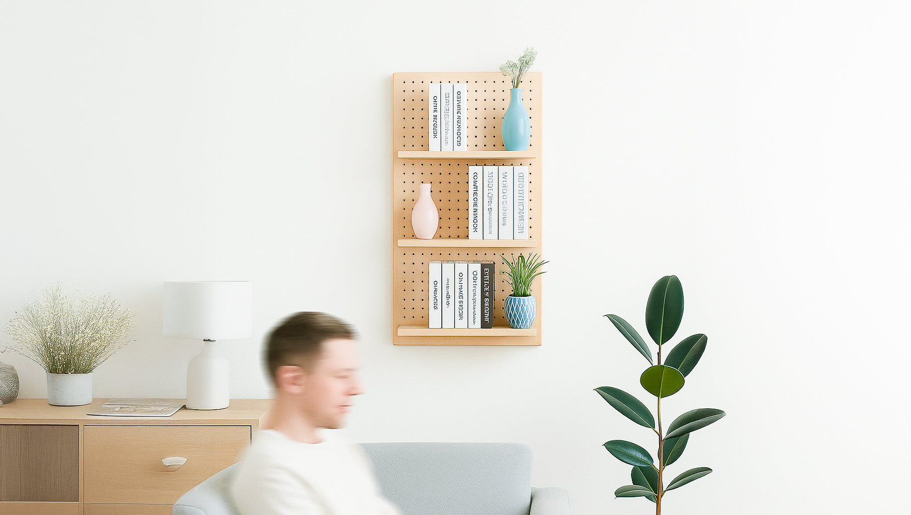 The Pegboard is a perforated wall board into which you can insert modular accessories (shelves, hooks, bins, etc.).
